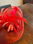 Red Fascinator Headband Mesh Bow Rhinestone Ribbon Feather Derby Church Hat 12 I