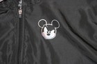 Style: Mickey Mouse hooded windbreaker jacket with full zip front and adjustable drawcord hem. Color: Black with iridescent holo Mickey face graphic on the chest and large "MICKEY MCMXXVIII" graphic on the back.