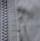 Rubber zipper pull is light gray as opposed to white. I believe the overall look of the jacket is very nice. 100% polyester, machine wash. Fabric is silky and stretches just a bit. 24-1/2" top to bottom.