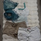 This unique lot is inspired by the mermaid Emma Gilbert from the early 2000s show “H20 Just Add Water”. This lot features two pairs of shorts that come with 2 different tops perfect for swapping around to make your own outfit or wear the way they are styled here. The blue tank top does have some stains since it’s from the 70s-80s so that is why I have the tank layered with it. This lot also comes with a special silver color locket with a white stone fixed on the front, straight from the depths of the moon pool on Mako island ;) Thanks for shopping