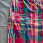Ruffle hem. All plaid pattern. Features V neckline. Side patch pockets. Cotton - Polyester. Color: Pink, Purple, Yellow, Green, Blue.