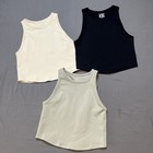 3 Seamless Ribbed Crop Tanks: High-neck, racerback silhouette in versatile neutral tones: Cream/Off-White, Sage Green, and Classic Black. Condition: Excellent Used Condition (EUC). Only cream top has minimal, unoticable "pilling" on the ribbed fabric and skirt has stains on waistband but it is washable.