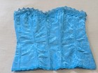 Super cute dainty lolita corset bustier style top. Blue satin with lace trim and little green bows. waist - 11".