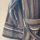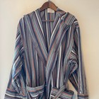 Ebru Bazaar Unisex Striped Peshtemal Bathrobe with Hood and Pockets. Expertly crafted in Turkey from 100% cotton, this high-quality dressing gown offers a lightweight yet absorbent feel, perfect for the spa, beach, or lounging at home. Featuring a classic multi-color vertical stripe pattern with earthy tones of orange, grey, and cream, this robe includes a matching waist tie and functional front pockets for convenience. The Peshtemal fabric is known for its quick-drying properties and soft texture. Excellent pre-owned condition. No stains, snags, or holes. Made in Turkiye.