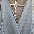 The denim fabric has minor fading throughout. The back zipper provides easy on-and-off access. Bell bottom flared leg openings. Retro V-neck design with exposed back zipper closure. Sleeveless styling with adjustable waist tie belt.