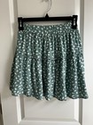 Lightweight tiered ruffle mini skirt in teal with an all-over white dot pattern. Elastic waistband for a comfortable, flexible fit. Soft, flowy fabric that moves easily for everyday wear. Fully lined. Pairs well with neutral tops and sandals. No size or care tag, but fits like XS and is machine washable. Measurements in photos. Aesthetics: boho, cottagecore, resort wear, vacation, festival, summer, beach