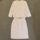 Elegant two-piece skirt suit by Emanuel Ungaro Woman featuring a soft neutral beige tone with a subtle jacquard floral texture. Material: 80% Rayon, 12% Wool, 8% Polyester. Size: Jacket 20 Skirt 22.