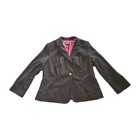 Lane Bryant size 18 womens blazer jacket. Black with purple and gray pin stripes. One button front closure. Decorative button on wrist. No holes or stains and smoke/pet free home. Armpit to armpit measures 25 inches across. Shoulder to bottom measures 25.5 inches.
