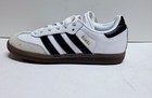 The product is a pair of Adidas Samba sneakers in white, size 1.5 for little kids. These lace-up sneakers feature a round toe, rubber outsole, and moderate cushioning. Designed for casual occasions in the summer, fall, and spring seasons, they provide comfort and are ideal for athletic activities. The shoes are part of the Adidas Samba product line and are made with leather upper material and foam insole. Perfect for active boys looking for stylish and practical footwear options.