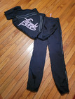 Girls size 14 Black and pink Franki Sport jogging suit. Pants have elastic waist and side pockets and side zippers; jacket is zip front with side pockets. Both are in good used condition (see photos).