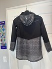 Ivivva hooded jacket featuring a black upper section and patterned gray lower section and cuffs. Full front zipper closure and zippered pockets. Lightweight and suitable for casual wear or light outdoor activities. Size 8, designed in Vancouver and made in Bangladesh. Care instructions included on the label.