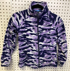Features unique purple, navy, white camo pattern. Full zip closure. High collar for added warmth, lightweight and cozy design. Ideal for layering in cold weather and outdoor activities.