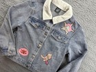 Brand: Disney Pixar Toy Story Style: Girls basic denim jacket with Toy Story Bo Peep and western cowgirl themed graphics. Size on tag: Girls Medium (8). Color: Light blue denim with an white corduroy collar and pink western accents. Materials: Cotton, rayon, polyester, acrylic blend denim shell, exclusive of decoration; unlined. Details: Snap front closure, snap cuffs, front chest flap pockets with snaps, side pockets, Bo Peep sheriff badge patch on chest, cowgirl boot and steer head patches on front, large "Cowgirl Era" chenille-style patch across back, collared short jacket length suitable for casual wear in fall or spring. Made in China with care and fiber content tag inside.