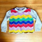Boden kids knit sweater with a vibrant rainbow chevron zigzag pattern across the front and back. Crafted from a soft cotton blend with a touch of wool, this long-sleeve pullover includes a classic crew neckline and ribbed cuffs in a contrasting light grey heather. The playful design is finished with a charming scalloped hem, making it a cheerful addition to any wardrobe. Suitable for everyday wear or special occasions, this piece combines comfort with a bold, colorful aesthetic. The condition overall is gently pre-loved and excellent with no flaws. Measures 13.5" flat armpit to armpit, 14.5" sleeves and 14" length shoulder to hem.