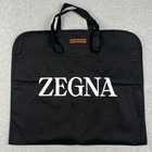 Durable black fabric with Zegna logo, full-length zipper closure, and carry handles at top and bottom. Lightweight yet structured for protection. Closure: Full zip and snap buttons. Handles: Top and bottom carry handles.