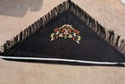 Black Floral Shawl is stylish perfect for various occasions such as theatrical productions. The floral design adds a touch of elegance used for costumes, reenactments, or theater performances, the Black Floral Shawl is sure to make a statement. It does have a few discolorations unable to see once on.