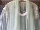 BEAUTIFUL SET!!! Some makeup on inside of collar along the inside seam. See pics. Beautiful lace and beadery on bottom of dress and shawl. See through negligee handmade bead work consists of White pearl tiny beads, Silver sequins, Silver jeweled teardrop and round beads, Embroidered silver lace It does have some weight to it. Metallic silver edging and collar. No size listed I would guess a medium rather than large. 11 inch diameter(5.5 inch wide)sleeve opening does not stretch. Waist 36 inch diameter max. Slight if any stretch. Wide skirt 50 inches outspread. Length Approx 37 inches. ♡THANK YOU FOR VIEWING♡