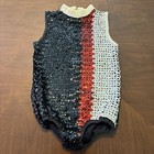 Up for sale is a nice black, Red, and White Sequin Majorette Uniform Made by Algy Dance Costumes of Hallandale, Florida. Costume is in good used condition with normal wear and usage for a garment of this age. Sequin colors are bright and shiny! Fully working back zipper and collar hook. Has some loose threads and slight staining to the neck area. Has not been dry cleaned and still has a good stretch to the fabric. Original tag is present on the inside. See pictures for details. Measurements made while garment was laid down flat. Shipping anywhere in the United States is by US Mail, Ground Advantage. Email any questions and thanks for looking! Chest (under arms) 14 inches Waist 13 inches Length 23 inches