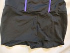 One Piece Romper Style Unitard. Short Shorts Bottoms and a Neckline That Ties as a Halter. Black with a Purple Piping Accent.