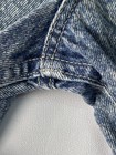 Style: Thick denim blue jeans with zip fly. Union made. Rise: 8.5". Materials: 100% Cotton. on front right leg - see photos. Minor fraying on cuffs. No other issues. Wash: Light blue.