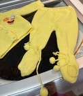 Hand Embroidered 100% Acrylic Sweater, Bonnet, Booties. Infant 3 Pc. Bootie Set. Plastic is yellow.