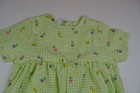 Size: My best guess is 12M. Design: Button-back dress with eyelet lace trim along collar and hem. Elastic in cuffs. Has ribbon bow safety-pinned at upper front. Color: Black, blue, pink, green, yellow floral print.