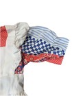 1 blue polka dot one piece sundress. 1 blue checkerd short sleeve shirt with (Nanette) no visible stain. 1 blue dress has stains on it. 1 red dress has stains. 1 short sleeve boy shirt no visible stain.