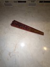 Vintage Handmade Lace Folding Fan with Laquered Wood Spines. Red and black design. Wood handle is red with speckled gold-color. Measures approximately 11". Please see photos for condition. Folds out and works great with no apparent tears. Slightly warped from previous use and handles have some wear. Ships via USPS Ground Advantage.