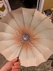 Antique folding carriage parasol. In good condition for age. All ribs are working. Up and down mechanism works. Lining has wear and a small hole, see photo. One rib needs the lining to be stitched back. This is an old piece and shows wear and tear. Underside of carriage measures about 18” Happy to take more photos or answer any questions. Please see photos as they are part of the description. Ships to continental US.