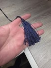 Here is a very old umbrella with croched fringe some soiling on fabric has wooden handle and tip meas about 33 in. Diam by 29 in. Long check pics