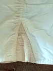 It is made of cotton and what feels like nylon blend on the top. There are 10 hooks down the front. There is a tiny light spot on the front. It looks as if it was never worn. I have not laundered this.