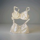 White lace and satin. Hook & eye closure on the back. The underwire area tries to curl under.