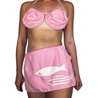 Authentic 1950s two-piece "bombshell" swimsuit by Saks Fifth Avenue, manufactured in Canada. This set is crafted from a durable pink cotton blend and features a structured bikini top with underwire, a halter-style tie, and a matching high-waisted skirt with a whimsical white fish applique.