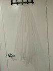 Headpiece wedding veil. Three-quarter knee length. Lace around entire edging from headpiece to headpiece. Beautiful blusher veil attached. Excellent condition.