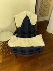 It is faux fur Sz 24 mo attaches st the top w a knot closure. Has a thick quilted lining. the bottom piece is ruffly. accented w rhinestones on the front. smoke and free.
