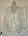 This White Lace Cover Up in Size Medium is stylish. Made from cotton lace, this cover up adds a touch of sophistication and glamour to your ensemble. Looks to be a size medium. No size tag. Measurement Sleeve 18.5" from shoulder seam to hemline, length is 23" from shoulder seam to hemline, across the back from armpit to armpit seam is 22" This jacket has a collar and ties in front. See my other items