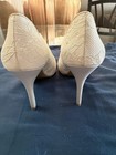 Pre-owned David’s Bridal ivory lace peep-toe heels. Elegant lace overlay with stiletto heel, ideal for wedding or formal occasions. Visible wear on soles and light signs of use (see photos). Overall good condition.