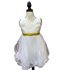 The White Flower Girl Sees With Gold Ribbon And Bow is a large-sized formal dress designed specifically for young flower girls. The dress features a beautiful white color with intricate gold ribbon and bow detailing, adding a touch of elegance and sophistication to the occasion. Perfect for weddings and formal events, this outfit is sure to make a charming and stylish impression on the special day. E