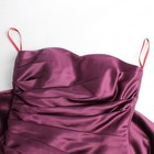 This is a pre-owned purple satin a-line prom dress in women's size XS. The dress does not have a size tag and measures about a size extra small. Features a strapless design with knee length satin material. 15" underarm to underarm and 29" from back top hem to bottom hem for a fitted silhouette. Lightweight and comfortable with a beautiful ruched texture on the front.