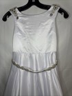 This White Satin Girls' Communion or Flower Girl Dress is a beautiful choice for young girls attending a special occasion like a wedding or formal event. Made from polyester, the dress features a classic white color and a elegant style that is perfect for a little flower girl. The size ranges from 12-14, ensuring a comfortable and flattering fit for young girls. This dress is a timeless and sophisticated choice for any formal occasion. There are no tags on this dress so I’m not 100% on the size based on the measurements I’d say size 14, very small stain in the front of gown.