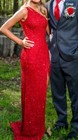 Ashley Lauren. One shoulder sequin/beaded long dress with asymmetrical lace up back. Size 00. Can be found online by typing in Ashley Lauren 11449. Daughter wore once on prom night for 4-5 hours. Great condition. She held the bottom of the dress while walking so there’s no dirt or damage at all to bottom of dress. Smoke free home. Did notice a very small area around 1 inch in diameter where the sequins/beading fell off. Just one thread came loose and not connected to any more sequins. So, should not get worse. Would be easy to sew a few back on. Paid $850. Asking $385. Message for more pics or details.