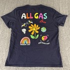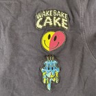Front features “Wake Bake Cake” graphics, while the back showcases large “ALL GAS Love” lettering with flowers, bees, rainbow, globe, and smiley face graphics. Soft cotton fabric with a relaxed fit and strong visual appeal.
