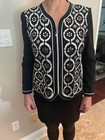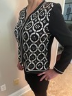 Roamans, size large 18/20. This top is part of a 2 piece set. Only one piece is up for sale. Lovely, black silk with a seed bead and sequin decoration. Accented with silver balls. The hem has a scalloped detail.