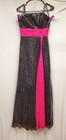 Pomuyoo Chiffon lace prom elegant formal gown. Gorgeous lace up back! Floor length in back. Shorter in front. Liner underneath. Excellent condition with no signs of wear. Is a size 12 and is displayed on a size 12 mannequin. The best feature is that it adjust to any size large because of the lace up back. So it can accommodate many bust sizes and most likely up to a size 14. Great deal as it usually retails for about 99.00 dollars. Total length from top of shoulder to floor in back is 59 inches. 46 inches in front.