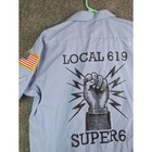 Dickies short sleeve industrial work shirt with custom union graphics. Features: • Dickies LS535LW work shirt • Men's size Medium • Blue color • "Local 619 Super 6" graphic on back • American flag sleeve patch • Button front • Durable workwear construction Condition: Pre-owned with normal wear. Graphics and patches are intact. Great shirt for collectors of union apparel, electricians, or vintage workwear fans.