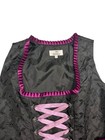 This is a very cute 2 piece dirndl outfit. Black and bright pink with cute details on the bodice. Iβm unsure on the size but the smallest part of the waist is 17 inches and arm pit to arm pit is almost 20 inches, so probably a XL