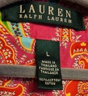 The Lauren Ralph Lauren Paisley Print Cotton Button Down Shirt in Woman's size Large exudes a bohemian vibe with its stylish paisley pattern and comfortable cotton material. This top is perfect for those looking for a chic yet relaxed fit that can be dressed up or down for various occasions.