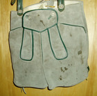 This product is a vintage authentic Lederhosen in a gray color, made in Germany. It is designed for children and crafted from leather, reflecting traditional German clothing styles. Perfect for special occasions or adding a touch of cultural charm to a child's outfit, this piece represents a unique and classic piece of apparel that celebrates heritage and craftsmanship. There are visible stains mostly on the front. It measures 10 inches long. The waistband is adjustable to 24 inches.