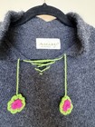 Light brown with dark brown, reddish-brown, and white design. Braided cord around the neck and down the front with cord tie center front. Acrylic knit.