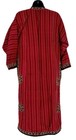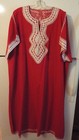 Women's red abaya/kaftan/galabeya with rounded neckline and short sleeves. Neckline is split center front - split measures about 4". Lots of white embroidery around the neck, down the front, around the bottom of each sleeve, and around the hemline. Unsized. Bustline measures approximately 29" on a yardstick; from center back neck to hemline is about 53". Unbranded. Cotton, but due to the embroidery, dry clean suggested. In excellent preowned condition with no rips or stains. Kept in smokefree petfree home since purchase.